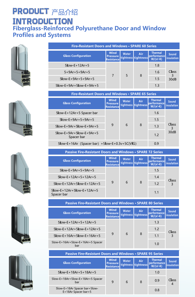 Portas e janelas em compósito de poliuretano reforçado com fibra de vidro são feitas por pultrusão. Suas estruturas principais usam perfis compostos especiais de grau aeroespacial e são preenchidas com espuma de poliuretano de grau B1. Essas portas e janelas têm vantagens excelentes: excelente isolamento, alta resistência, boa resistência ao fogo, dimensões estáveis, baixo uso de energia de produção e aparência diversificada. A transmitância térmica do material da estrutura é Uf <0,68 W/(m2-K), e toda a janela pode atingir 0,8 W/(m2-K). Esta estrutura de material especial oferece mais opções de instalação, adequando-se à maioria das certificações de casas passivas, mesmo com instalação embutida. É econômico e reduz os custos de construção de casas passivas.